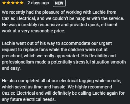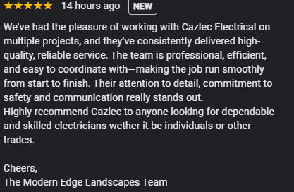 At Cazlec Electrical we strive to offer the highest quality of services. We are recommended by our clients, as well as industry and trade professionals! Check out some of our reviews by clicking the button below to see our Google Business Reviews! See why we are the Electrician Newcastle Homeowners and Businesses go to!